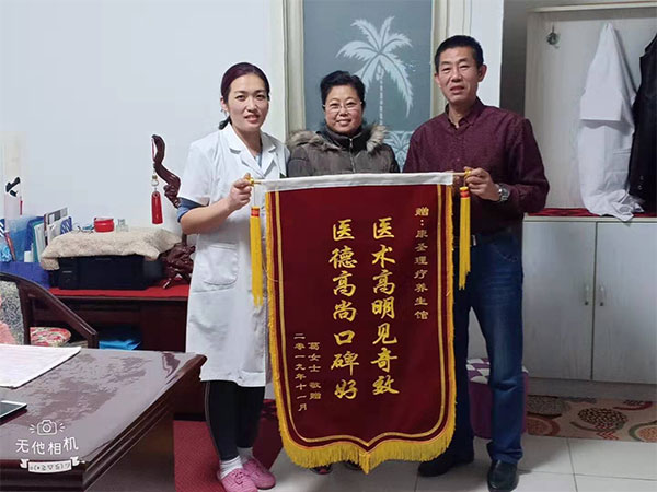 加盟店康圣理疗养生馆患者颈椎增生!狭窄!钙化多年,经过调理痊愈后!赠送锦旗留念!